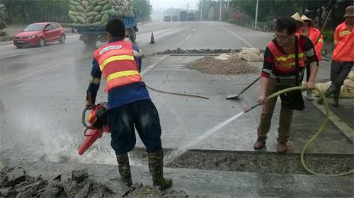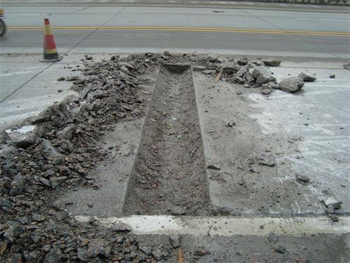 用風鎬鑿除劃線范圍內的混凝土,鑿除深度一般為板厚的二分之一約12cm(不得低于10cm),鑿除時應從劃線內區(qū)域向外鑿除,避免出現(xiàn)啃邊現(xiàn)象。如果面板已出現(xiàn)比較嚴重的錯臺、脫空,建議先打孔壓漿后再進行修補。