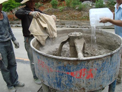 根據(jù)修補區(qū)域面積計算所需修補材料用量(以單塊路面板為單位計算),盡量做到一次性鋪裝。鋪裝工序及坑槽充分吸水飽和且無明水時進行材料攪拌。用攪拌機先干拌SC型修補料和干凈碎石,修補料與碎石質量比為1:0.8/1(碎石是直徑在10-30㎜連續(xù)級配石子,還要經水清洗過),攪拌均勻后,再加干凈的水攪拌,加水量以檢測報告提供的數(shù)據(jù)為依據(jù),直至攪拌均勻。觀察無干粉球和氣泡,如果仍有干粉球和氣泡,可靜止一分鐘后再攪拌,攪拌時間在3-5分鐘左右為宜,不宜時間過長,防止材料在攪拌機內凝固。注意控制好水灰比,攪拌好的修補料不得泌水。